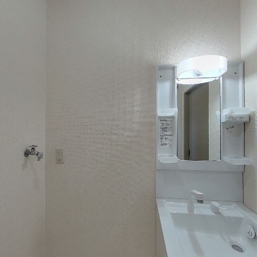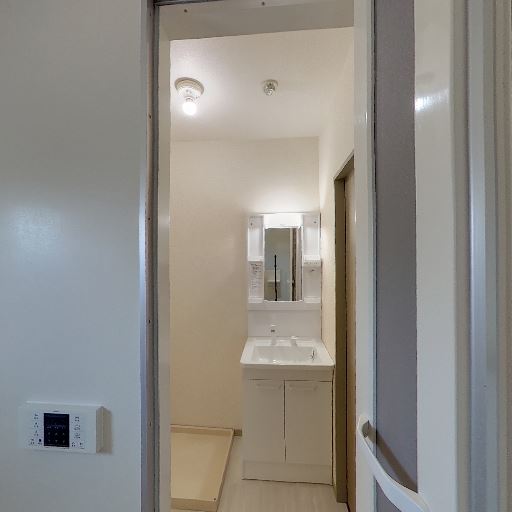 • 洗濯機置き場が室内にある(確度95%):洗面スペース内の壁面に給水栓があり、床側にも洗濯機置き場とみられる防水パンが確認できる。室内洗濯機置き場の可能性が高い。