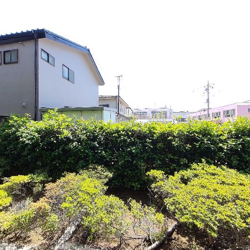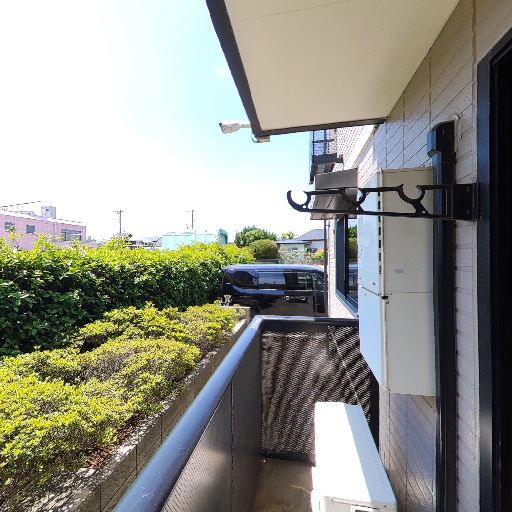 • 前面は植栽越しに隣家や道路が近い(確度82%):バルコニー前方に植栽はあるものの、その先に隣接住宅や駐車車両、周辺建物が見えており、開放感はやや限定的である。