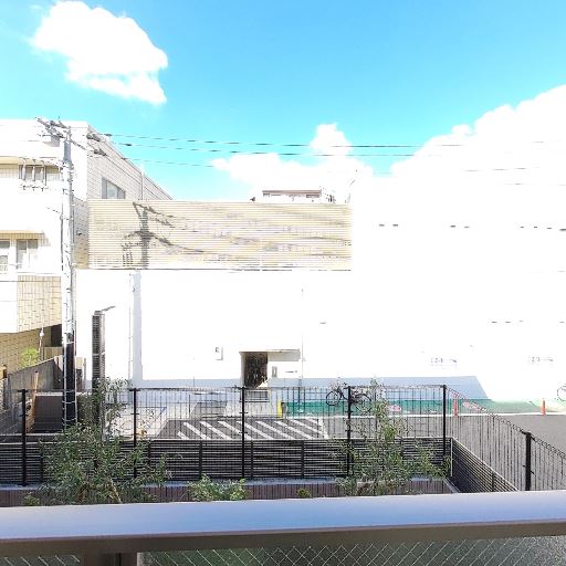 眺望と開放感は中程度(確度67%):前面は道路と向かいの建物で抜けは限定的。フェンスや建物が近いが、空は見える。