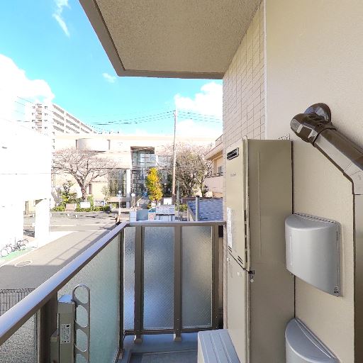 プライバシー・外部環境(確度55%):バルコニーの先に他建物が近接しており、視線や音の影響がある可能性。すりガラスの手すりで目隠しはされている。