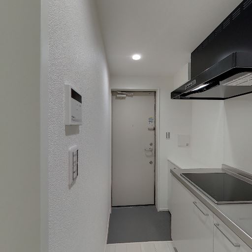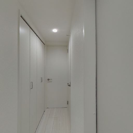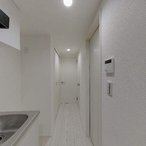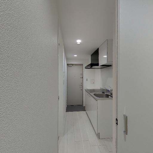 • 玄関からキッチンまでの細長い廊下(確度83%):玄関ドアから一直線にキッチンへ続く細い通路状のレイアウト。天井ダウンライトで明るさは確保されている。