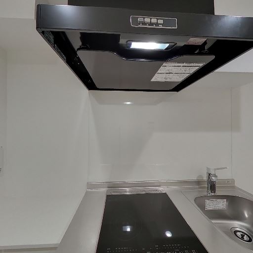 • キッチン設備(IH・レンジフード)(確度83%):2口程度のIHクッキングヒーターと大型のレンジフードが見える。シンクはコンパクト。