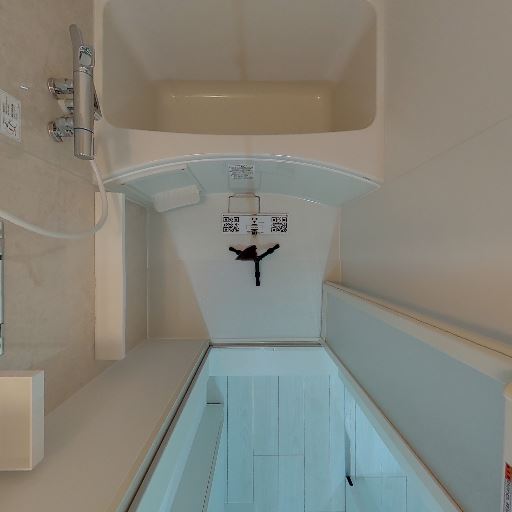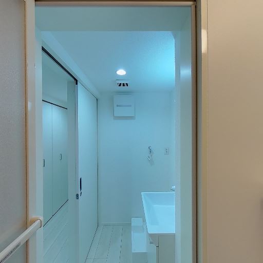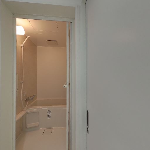 • 浴室が隣接(確度86%):引き戸の先に浴槽とシャワーが見える。脱衣所と一体のレイアウト。