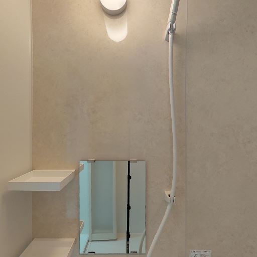 • シャワー・収納棚・ミラーの使い勝手(確度86%):壁付けのハンドシャワー、2段のトレイ棚、腰高のミラーが設置されている。