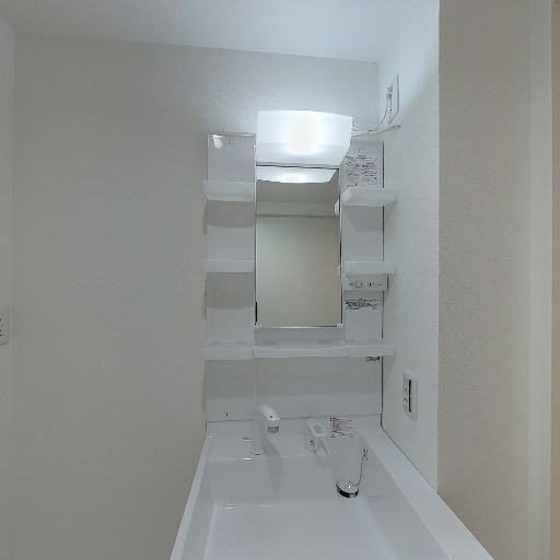 • 独立洗面台と収納棚(確度87%):鏡付きの独立洗面台があり、両脇に小物用の棚が複数備わっている。コンセントも確認できる。
