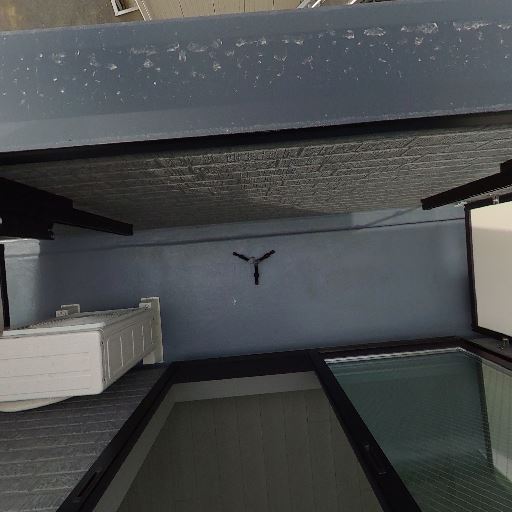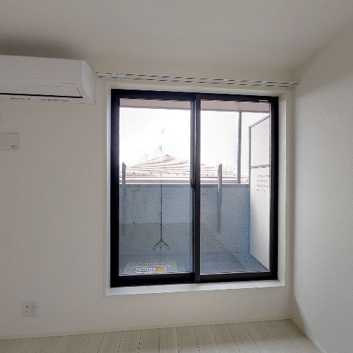 • バルコニー付きの掃き出し窓(確度86%):大きな引き違い窓の先に小さめのバルコニーが見える。物干し金物が設置されている。