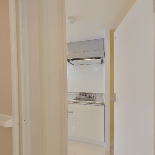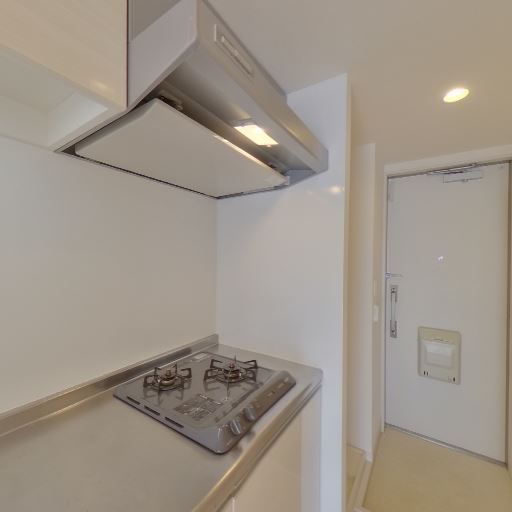 • コンパクトなキッチンが玄関近くに配置されている(確度91%):廊下沿いに単身者向けと思われるコンパクトなキッチンが設置されている。シンク・加熱機器・レンジフードがまとまっており、最低限の自炊設備は整っている。