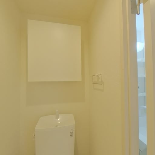 • トイレ上部に収納棚がある(確度92%):便器の正面上部に扉付きと思われる収納棚が設置されており、トイレットペーパーや掃除用品をしまえる構成に見える。