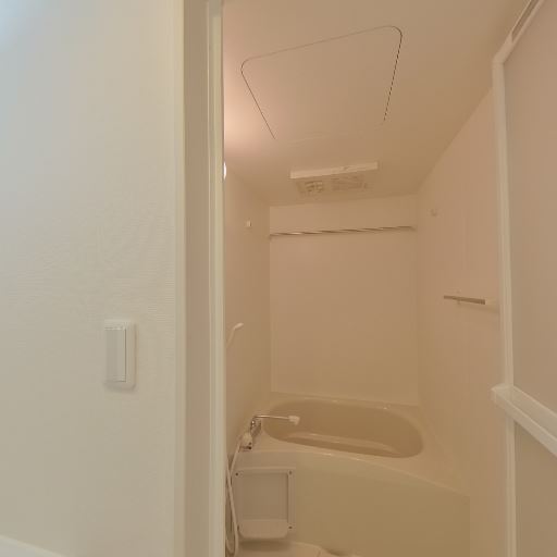 • 浴室は清潔感のあるシンプルな印象(確度80%):浴槽、壁、天井ともに明るい色味で統一されており、目立つ汚れや強い使用感は画像上では見当たらない。