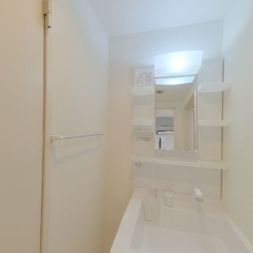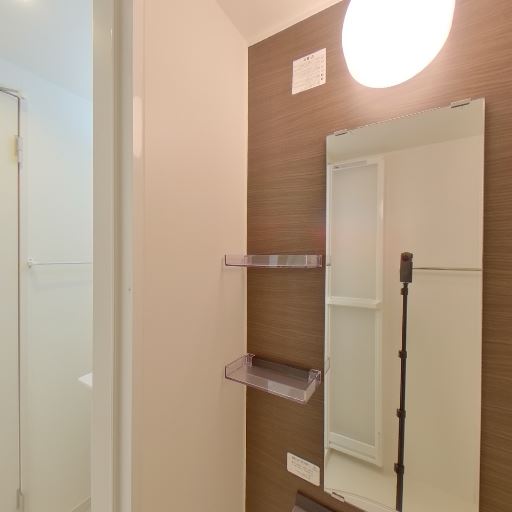 • 収納・小物置きが最低限確保されている(確度83%):鏡横に小型の棚があり、洗面用品を置けるスペースが確保されている。タオル掛けも複数確認できる。