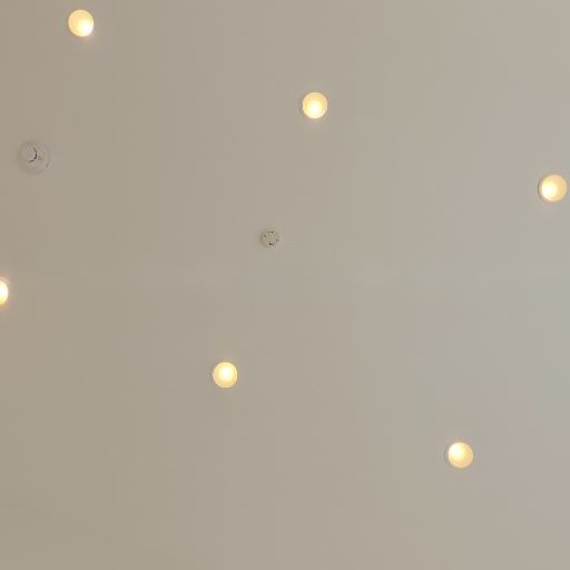 • ダウンライトで照明がすっきりしている(確度84%):天井に複数のダウンライトが配置されており、出っ張りの少ないすっきりした印象の照明計画になっている。