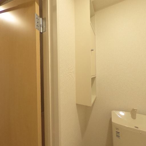 収納スペースあり(確度83%):便器上部の壁面に吊戸棚があり、トイレットペーパー等の収納が可能。