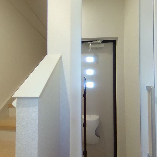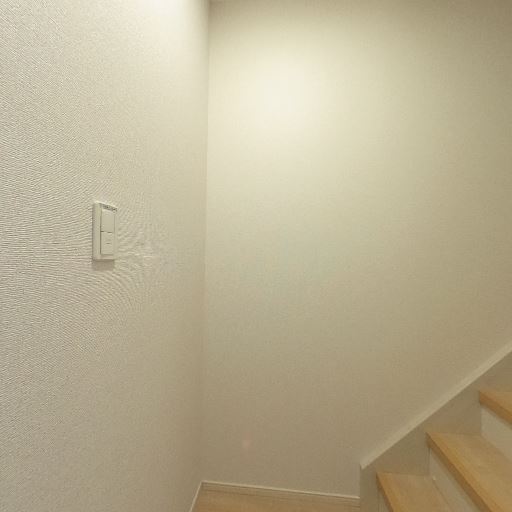 手すり付きの階段で安全性あり(確度86%):玄関脇に上階へ上がる階段があり、手すりが設置されている。