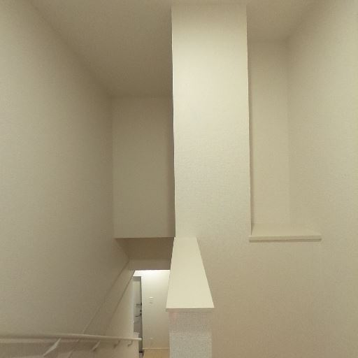 吹き抜けと階段のあるホール(確度78%):上下に高さのある空間で、階段の途中に小さなカウンター状の出っ張りやニッチが見える。