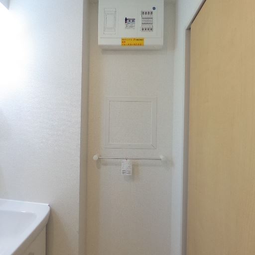 給湯・設備パネルの位置(確度73%):壁上部に給湯器関連の機器と操作盤があり、点検口とタオル掛けもある。