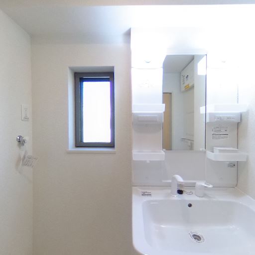 独立洗面台と収納付き(確度86%):洗面ボウルが広めで、鏡まわりに小物棚が複数ある独立洗面台が確認できる。