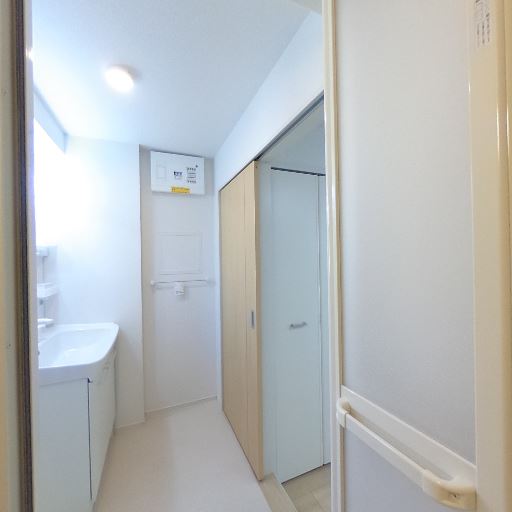 洗面室と浴室が隣接(確度86%):洗面台のある明るい洗面室から引き戸で浴室に続く動線。収納(引き戸のクローゼット)も見える。