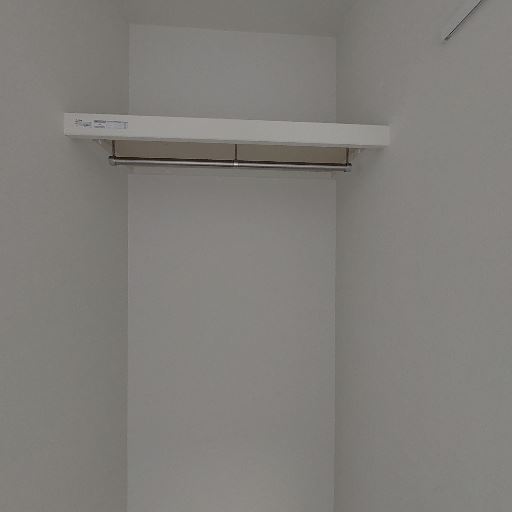 クローゼット(ハンガーパイプ+上棚)(確度86%):壁面に上棚とハンガーパイプが備わったクローゼットスペースがある。