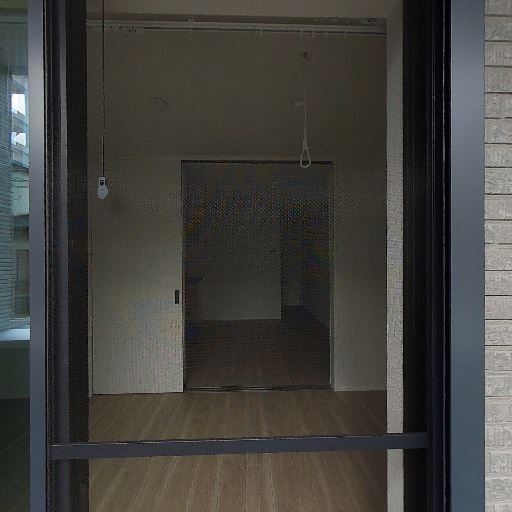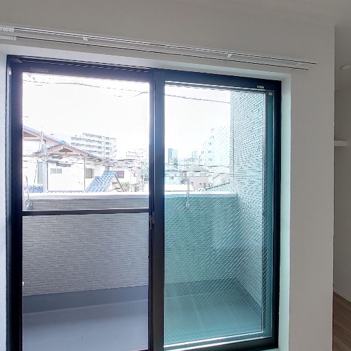 バルコニー付きの大きな掃き出し窓(確度90%):床から天井近くまでの引き違い窓と小さめのバルコニーが確認でき、外景が抜けている。
