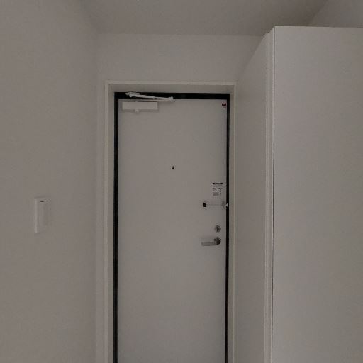 玄関ドアとシューズ収納(確度83%):正面に玄関ドア、右側に背の高い収納があり、靴収納と思われる。玄関スペースはコンパクト。