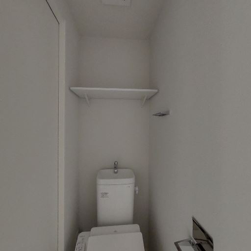 トイレ個室の設備(確度86%):タンク一体型の洋式便器があり、上部にシンプルな棚板が1段設置されている。紙巻器とリモコン/スイッチ類も見える。