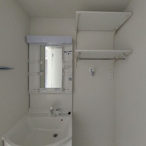独立洗面台と上部収納(確度84%):洗面化粧台の横に可動棚とハンガーバーがあり、タオルや洗剤の収納ができる。