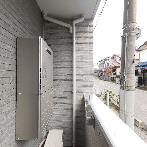 エアコン室外機・給湯器設置済み(確度88%):バルコニーに室外機と給湯器ボックスが取り付けられている。
