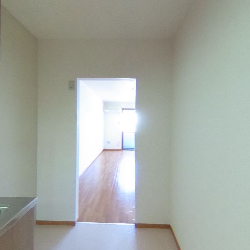 ダイニング側への動線(確度70%):キッチン横に開口があり、奥にフローリングの居室が見える。