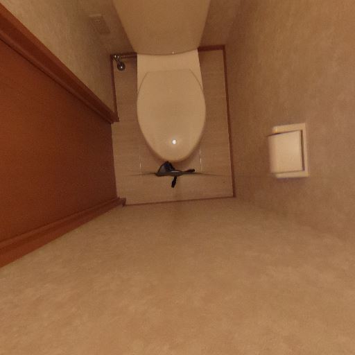 トイレ個室(確度94%):便器と手洗い一体型タンクがあり、個室のトイレである。背面に棚、右側にタオルバー、左側にドア。紙巻器は便器右側の壁に設置。