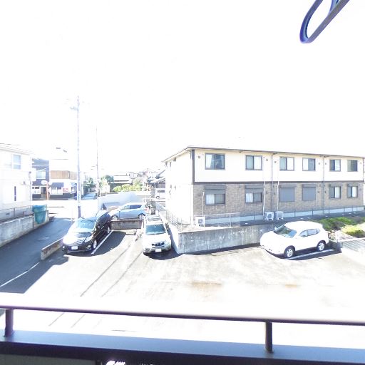 バルコニーからの視界・抜け感(確度82%):駐車場と低層住宅が広がり、正面の建物まで距離があるため視界が開けている。圧迫感が少なく日当たりも良さそう。
