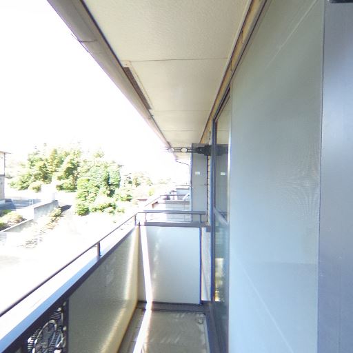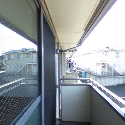 バルコニースペースの広さ(確度63%):通路幅は人が歩ける程度で、物干しスペースはあるが奥行きは大きくない。室外機も置かれており可動域は限定的。