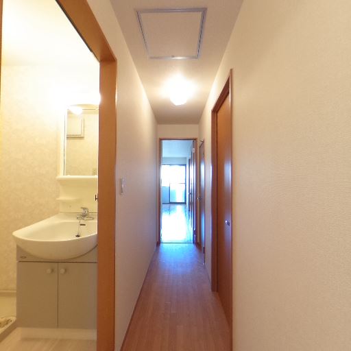 縦長の廊下動線(確度74%):玄関から先にまっすぐ伸びる廊下があり、奥に居室。途中に洗面所やトイレ等の水回りが配置されている。