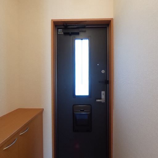 玄関収納の存在(確度80%):玄関左側に下駄箱と思われる収納があり、取手が2つ見える。