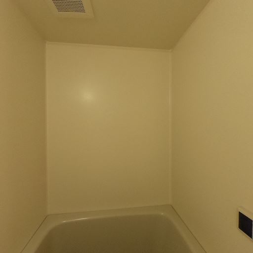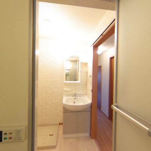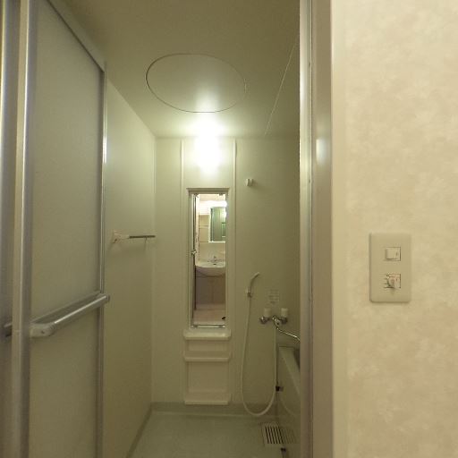 換気設備の存在(確度72%):脱衣所壁面に換気口、天井には照明と換気関連の設備が見える。