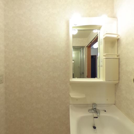 独立洗面台と収納付きミラー(確度86%):洗面ボウル一体型の独立洗面台で、三面鏡風の収納棚と照明が付いている。
