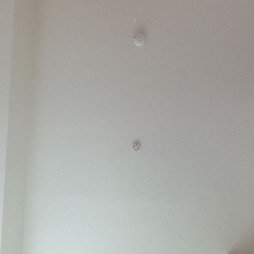 天井設備(確度77%):天井中央に引掛シーリングと火災報知器が確認できる。天井に大きなシミや亀裂は見当たらない。