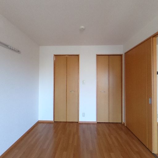 収納が充実(確度78%):同一面に縦長のクローゼット扉が2枚見え、収納量が確保されている。