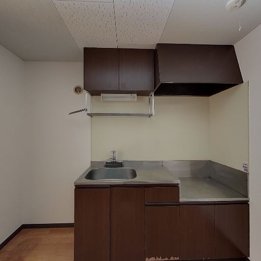 • キッチンの状態(確度84%):単身向けサイズの流し台とコンロ置き場。換気フード・吊戸棚あり。シンク下扉の下辺に剥がれが見える。
