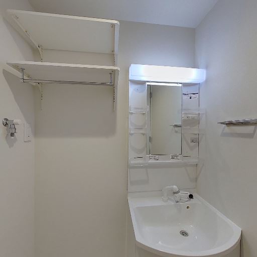 独立洗面台と収納(確度86%):照明付きミラーの独立洗面台があり、横にオープン棚とタオルバーが設置されている。洗面ボウルは浅すぎず使いやすそう。