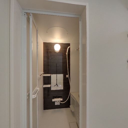 浴室への動線(確度78%):引き戸の先に浴室があり、ダークパネルと手すり・シャワーが見える。ユニットバスで清潔感がある。