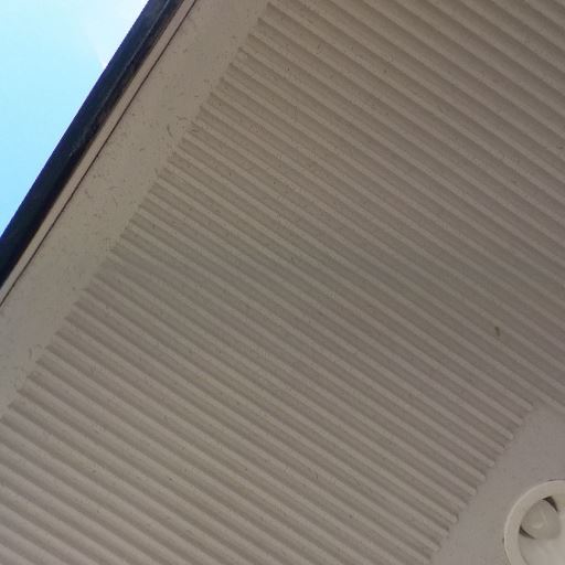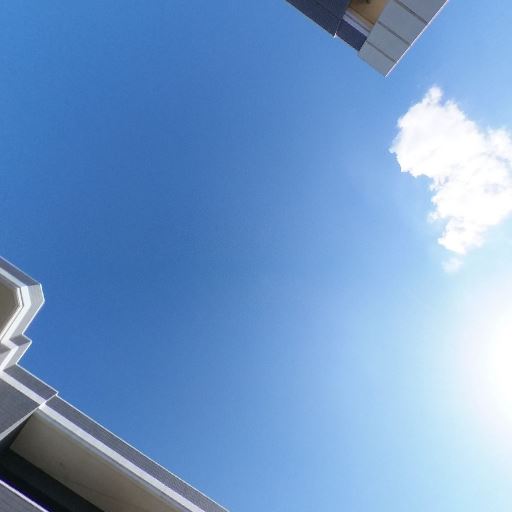 • 日当たりは良好な可能性(確度72%):強い直射日光と影のコントラスト、雲の少ない快晴の空が見える。