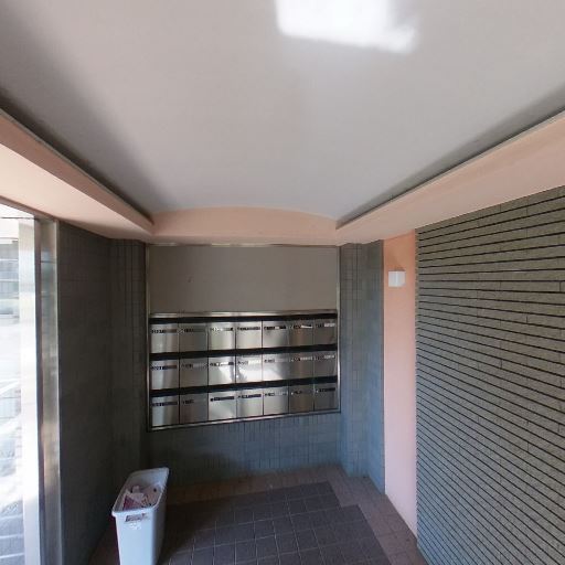 • エントランスの共用ポスト(確度86%):壁面に多数のメールボックスが整然と設置されている。