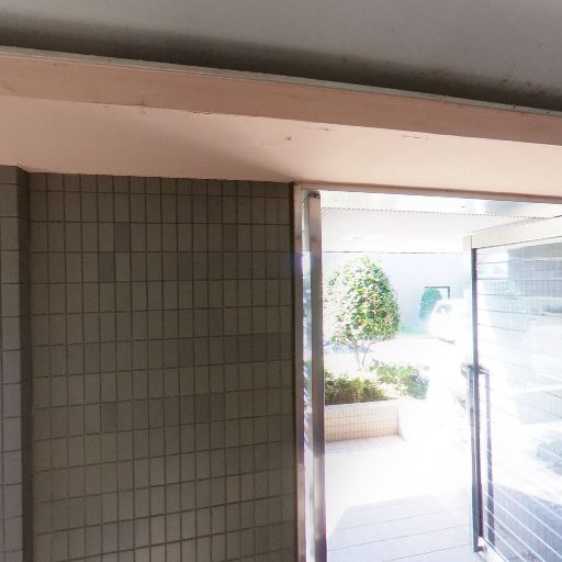 • 採光のあるエントランスホール(確度80%):ガラス扉と窓から中庭側に光が入り、明るい共用部になっている。