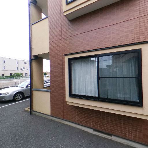 • 共用通路と駐車場側への開放感(確度86%):建物の間の通路がそのまま外部空間とつながっており、正面側には駐車場や道路方向への抜けが見える。閉塞感は比較的少ない外部共用部と判断できる。
