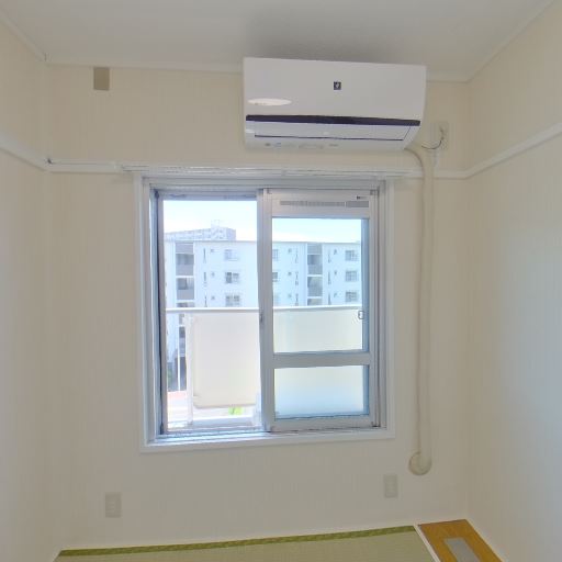 エアコン設置済み(確度95%):窓上に壁掛けエアコンが設置されている。