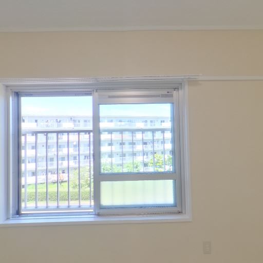 採光と眺望(確度84%):腰高の大きめの窓があり、外に集合住宅と緑が見える。日中は十分な明るさが期待できる。