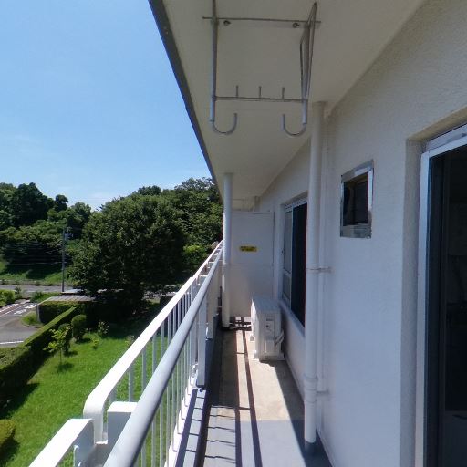 バルコニーの広さと使い勝手(確度86%):手すりがしっかりしたロングバルコニーで、物干し金具と室外機設置スペースがある。