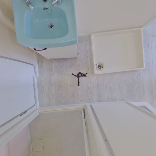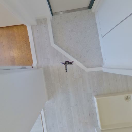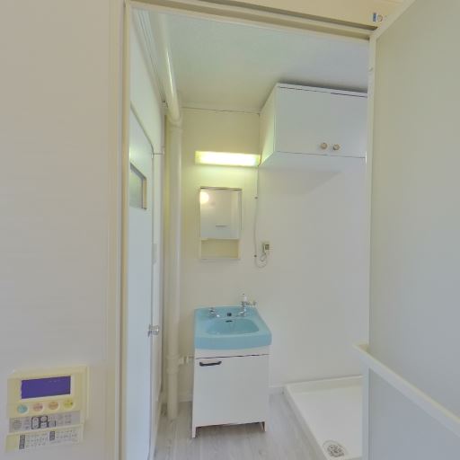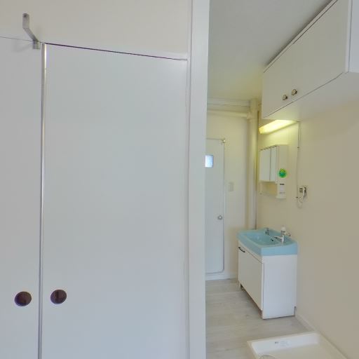 洗面・脱衣所のあり(確度82%):廊下続きに小型の洗面台と上部吊り戸棚が見える。洗濯機置き場のパンも確認できる。