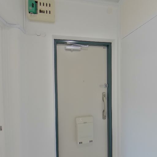 玄関まわりの状態(確度78%):玄関ドアや枠、ドアクローザーが整備されており、全体的に清潔感がある。上部にブレーカーが設置されている。