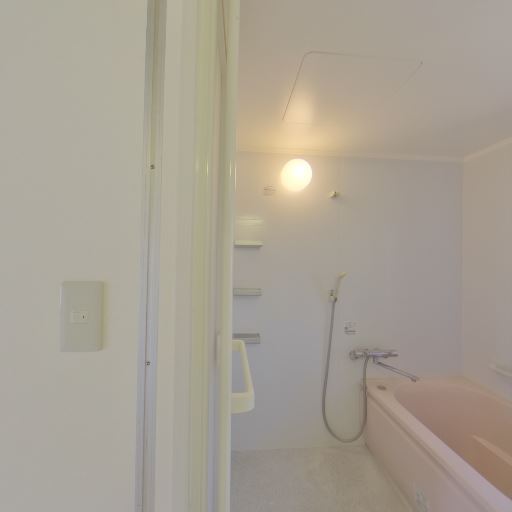 バスルームの様子(確度80%):浴室はユニットタイプで、ピンク系の浴槽と手元シャワー、壁付けライトが見える。清掃状態は概ね良好。